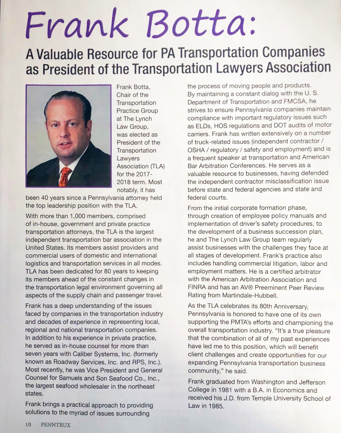 Frank Botta, who leads The Lynch Law Group’s Transportation Practice, was featured in the January 2018 issue of PennTrux, the official magazine of The Pennsylvania Motor Truck Association (PMTA). Botta has vast experience assisting companies in the transportation and logistics industry. In addition, he is immersed in the Transportation Lawyers Association (TLA), where he has been an active and contributing member for many years.